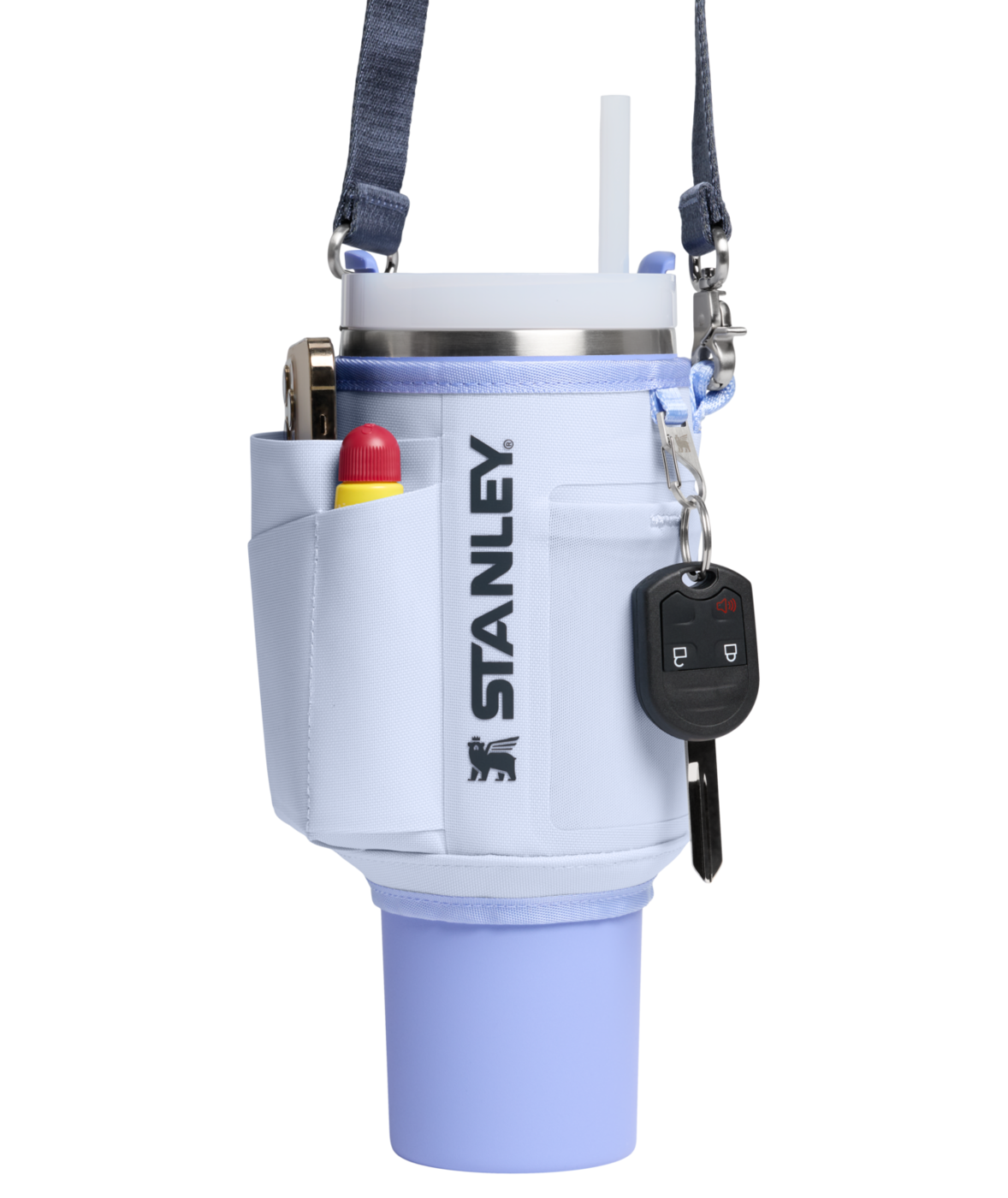 Fest den justerbare stroppen på tvers av kroppen, og beveg deg fritt med begge hender ledige. Den slitesterke stroppen, foret med et unikt winged bear-mønster, festes sikkert rundt din 1.18L Quencher med en dobbel trykknapplukking.